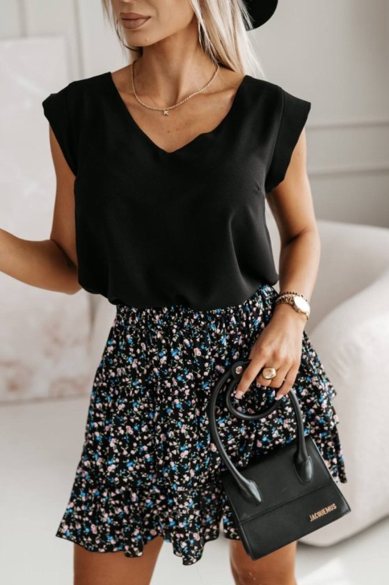 Kadın üst Sandy Kumaş Bluz, Alt çiçek Desenli Süprem Kumaş Etek Ikili Takım Modelin Ölçüleri: Boy:165, Kg:55, Göğüs:90, Bel:72, Kalça: 100 Modelin üzerindeki ürün M/38 bedendir
