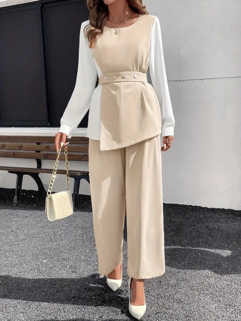 Kadın Uzun Kollu Açık Yakalı çift Renkli Kemerli Ithal Krep Ikili Takım Modelin Ölçüleri: Boy:165, Kg:55, Göğüs:90, Bel:72, Kalça: 100 Modelin üzerindeki ürün M/38 bedendir KOL UZUNLUK-Uzun KolTAKIM OZELLIK-Pantolonlu TakımEK…