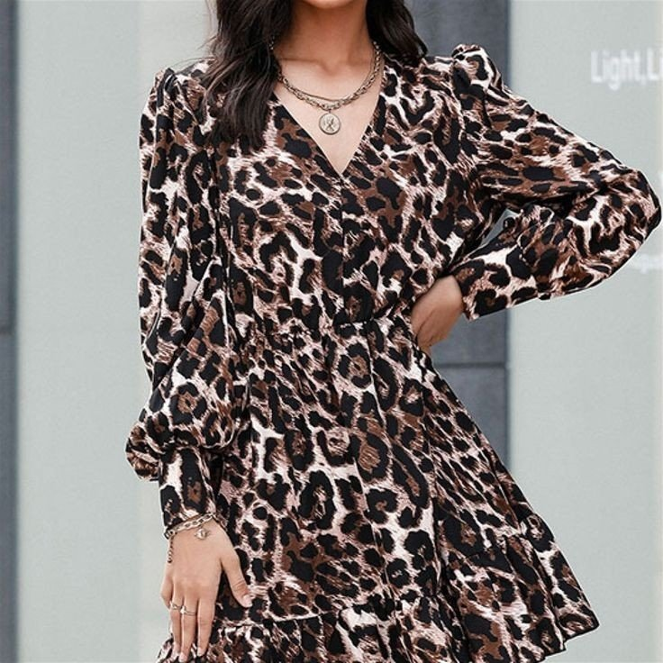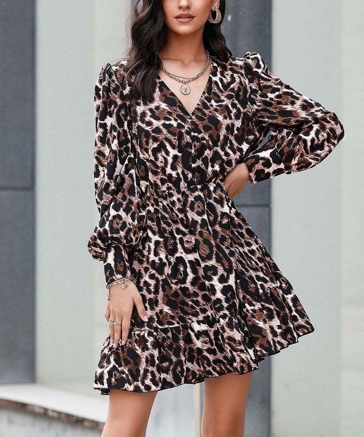 Kadın Uzun Kollu Beli Lastikli Etek Ucu Volanlı Leopar Desen Krep Elbise Modelin Ölçüleri: Boy:165, Kg:55, Göğüs:90, Bel:72, Kalça: 100 Modelin üzerindeki ürün M/38 bedendir EK OZELLIKLER-Boş/Ek özellik YokTARZ-DigerUZUNLUK-DiğerleriYAKA-DiğerleriDESEN-DiğerleriKOL UZUNLUK-Uzun…