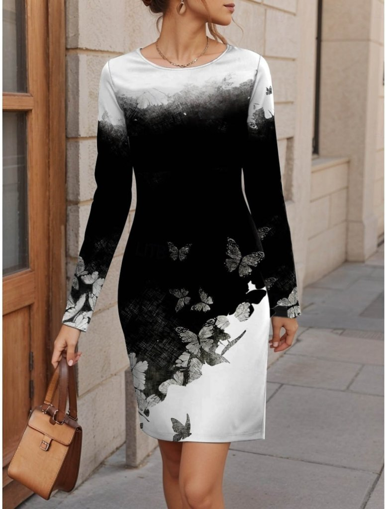Kadın Uzun Kollu Bisiklet Yaka çiçek Desenli Kısa şardonlu Dalgıç Elbise