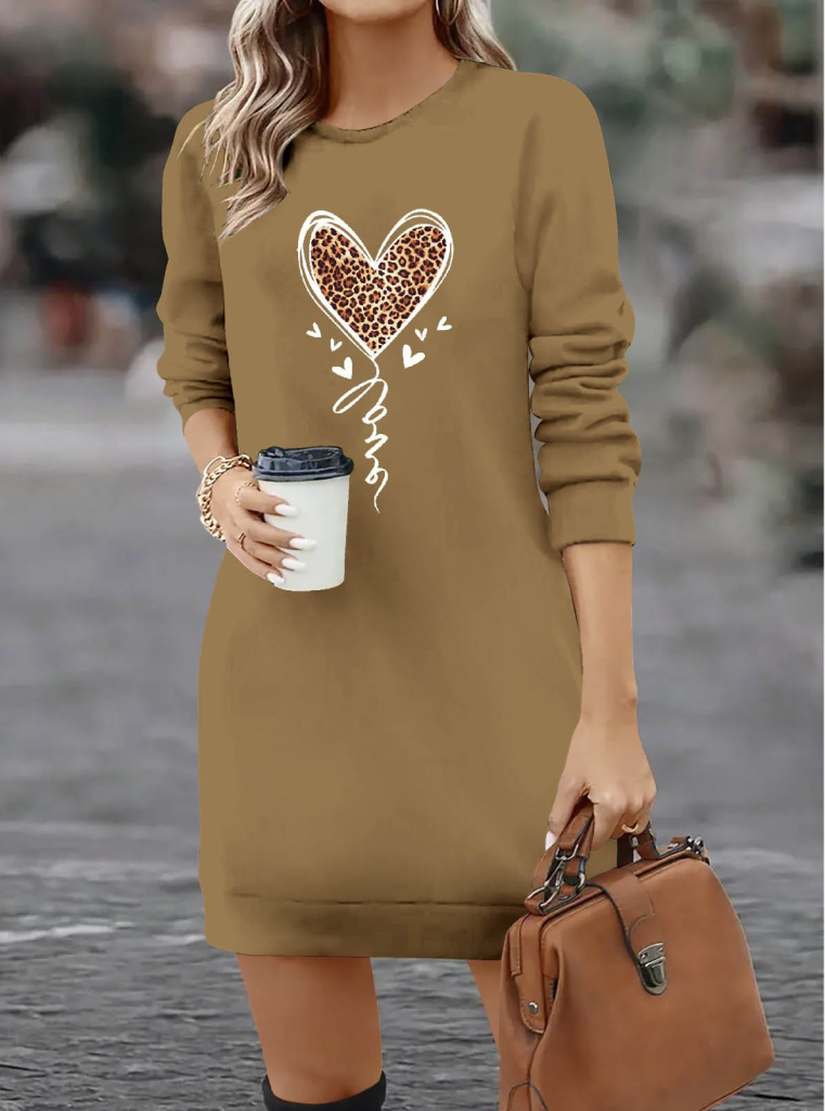 Kadın Uzun Kollu Bisiklet Yaka Kalp Desenli Kısa Viskon Elbise