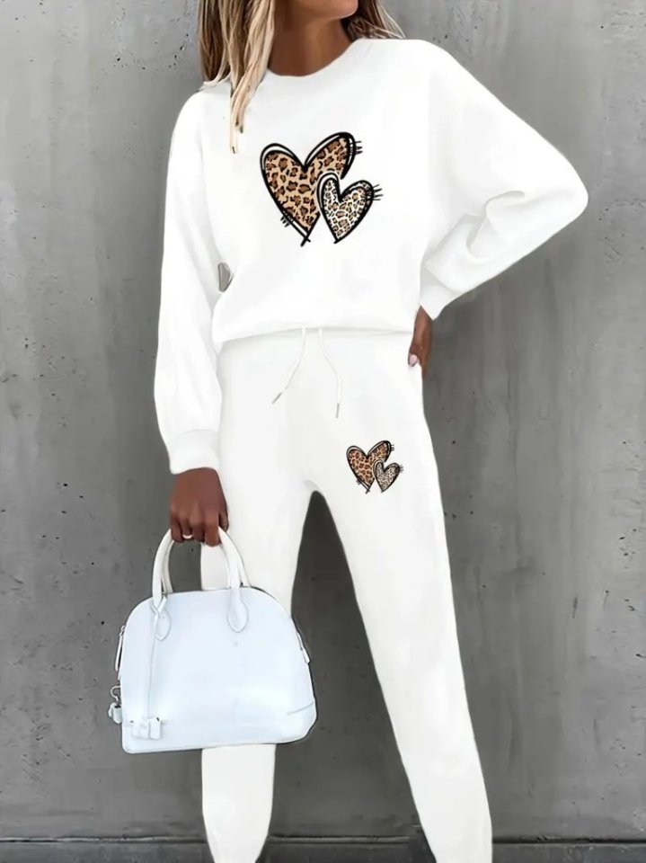 Kadın Uzun Kollu Bisiklet Yaka Kalp Desenli şardonlu üç Iplik Bluz Ve Pantolon Ikili Takım