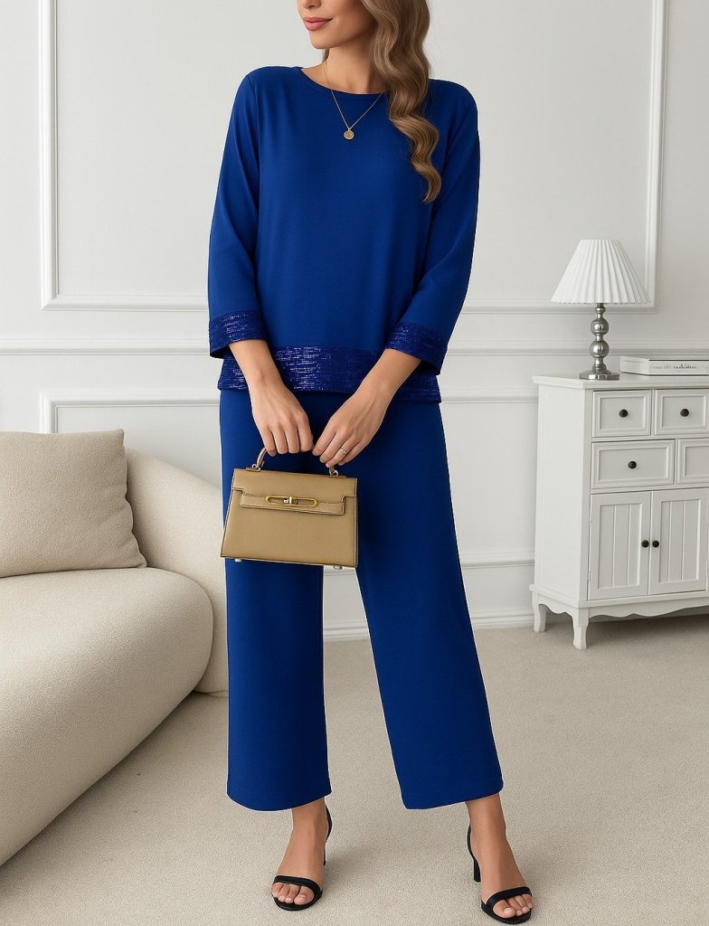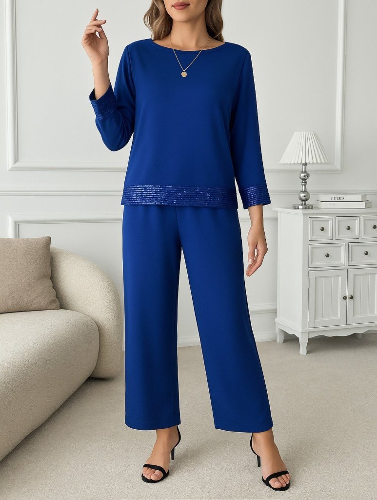 Kadın Uzun Kollu Bisiklet Yaka Pulpayetli Viskon Iki Iplik Bluz Ve Pantolon Ikili Takım