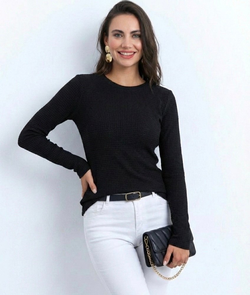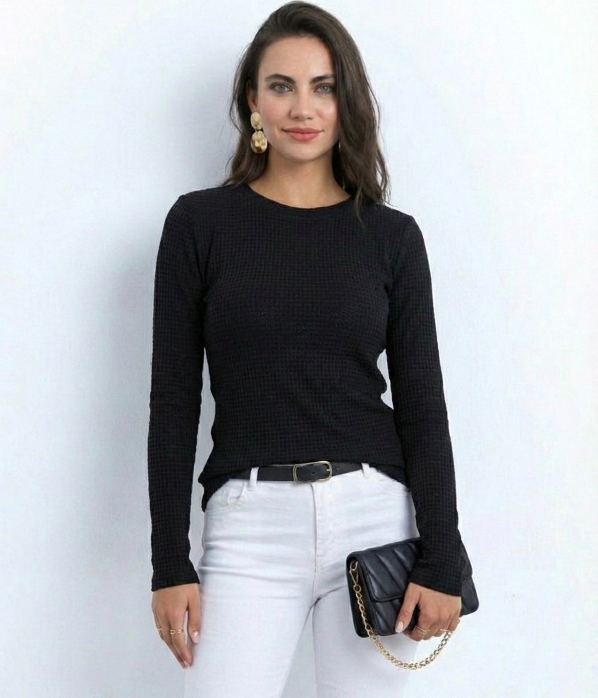 Bisiklet Yuvarlak Yaka Triko Kazak Pamuklu Kalın Fitilli Dokuma, Regular Fit Uzun Kollu Kışlık Model – Siyah