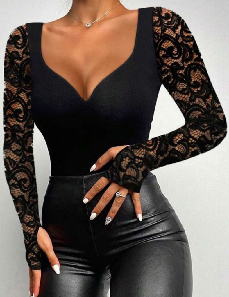 Kadın Uzun Kollu Dantelli Dekolte Detaylı Dalgıç Bluz Modelin Ölçüleri: Boy:165, Kg:55, Göğüs:90, Bel:72, Kalça: 100 Modelin üzerindeki ürün M/38 bedendir DESEN-DiğerleriKALIP-Klasik