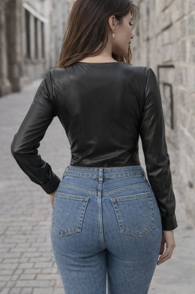 Kadın Uzun Kollu Derin V Yakalı Deri Zıbın
