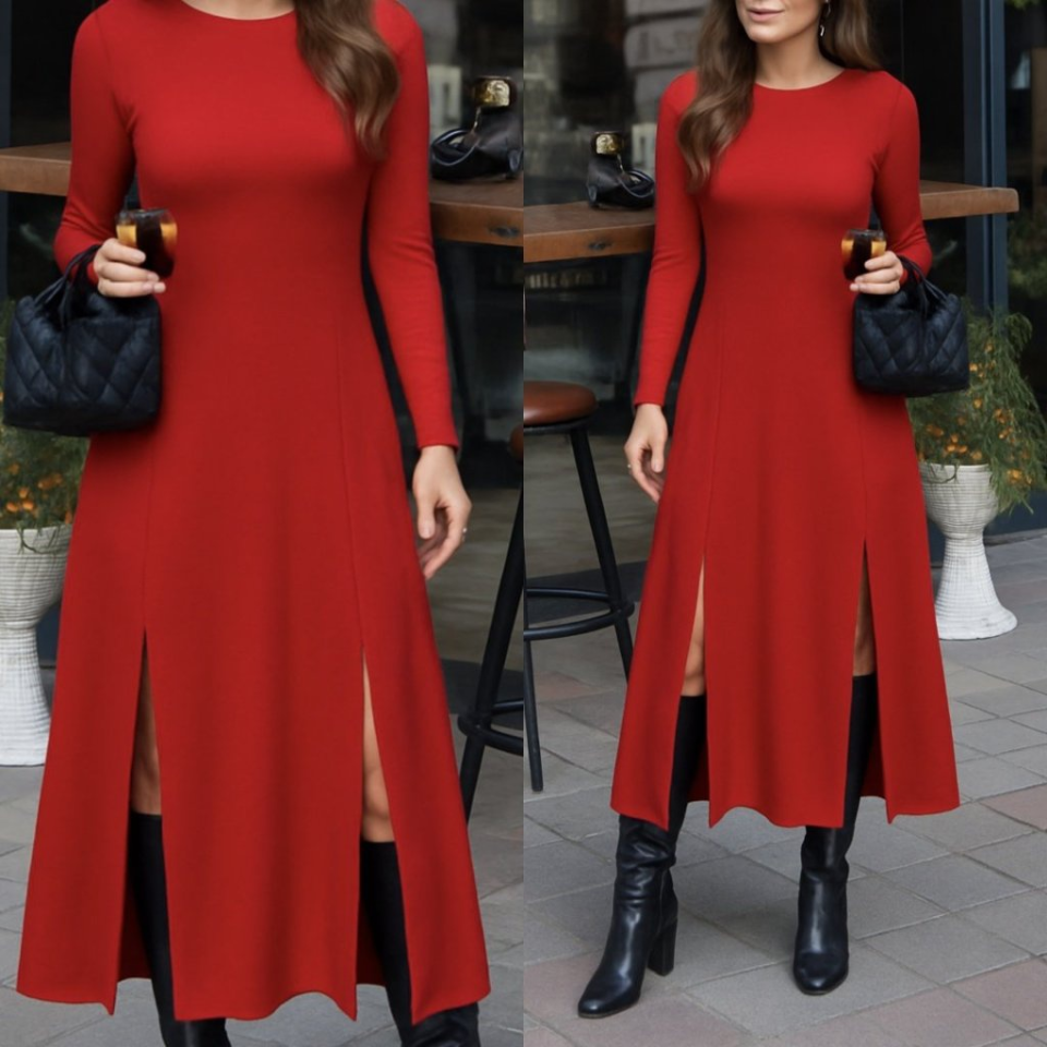 Kadın Uzun Kollu Hafif Kayık Yaka Sırt Dekolteli Yırtmaç Detaylı Viskon Tam Boy Elbise