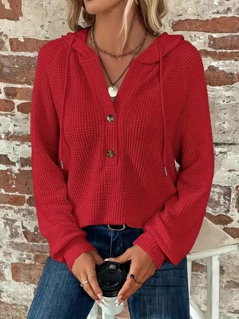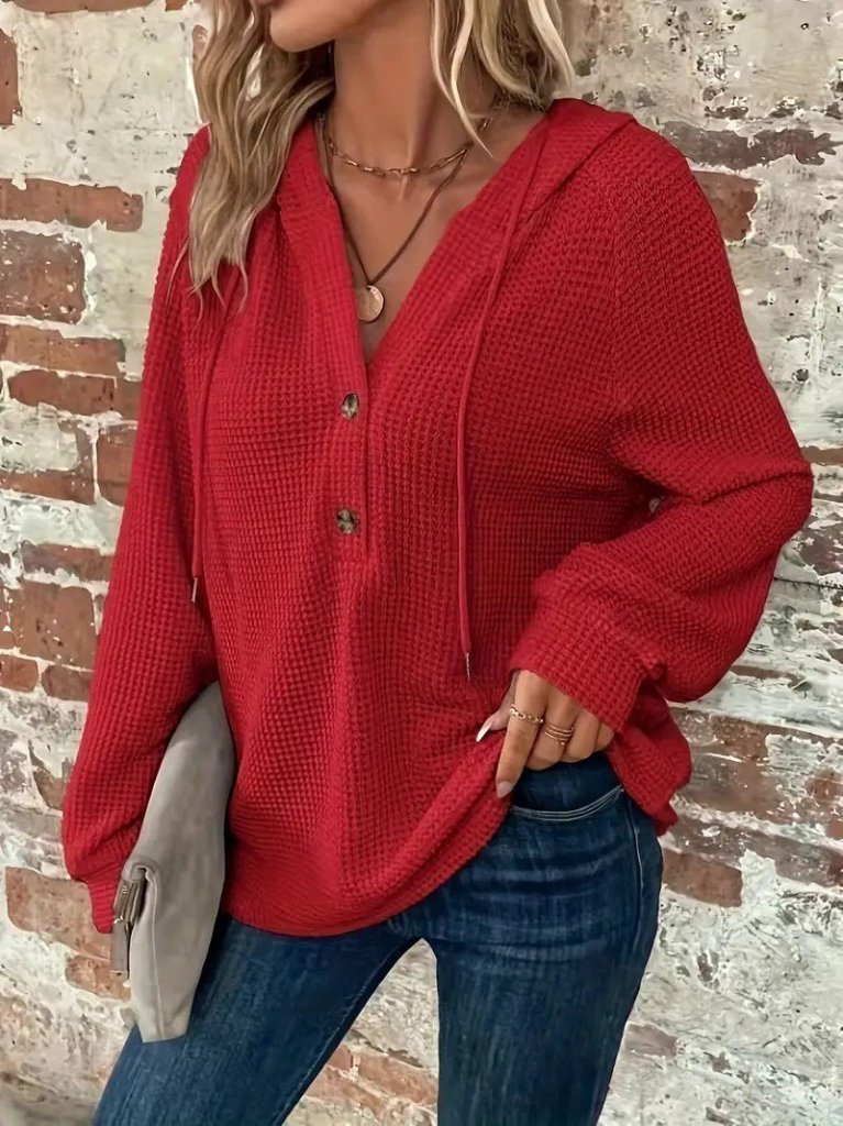 Kadın Uzun Kollu Kapşonlu önü Düğmeli Ve Bağcıklı Waffle Bluz