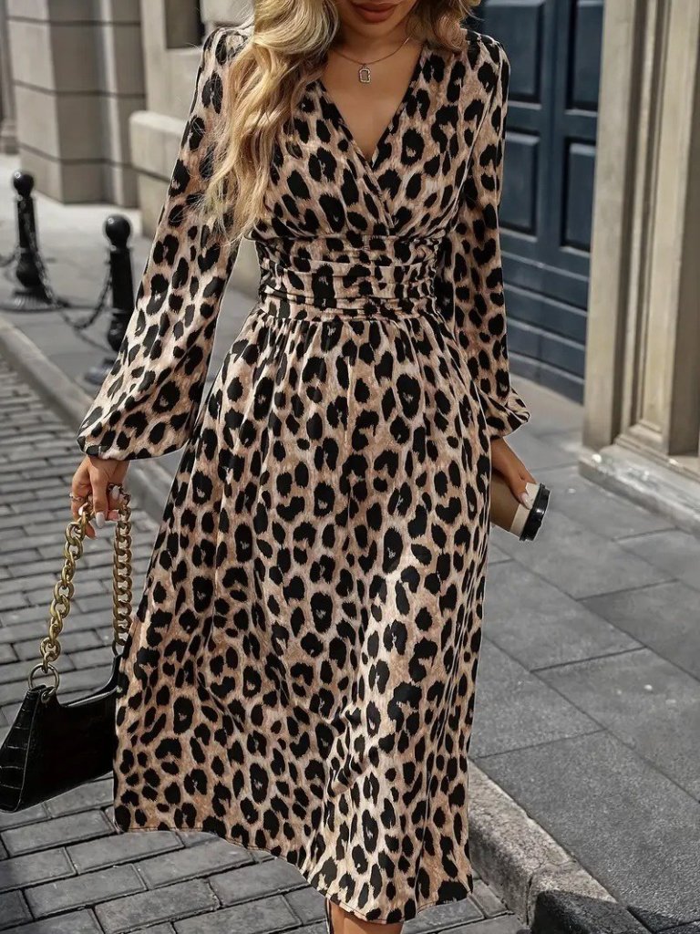 Kadın Uzun Kollu Kruvaze Yaka Belden Oturtmalı Midi Modal Leopar Desenli Elbise