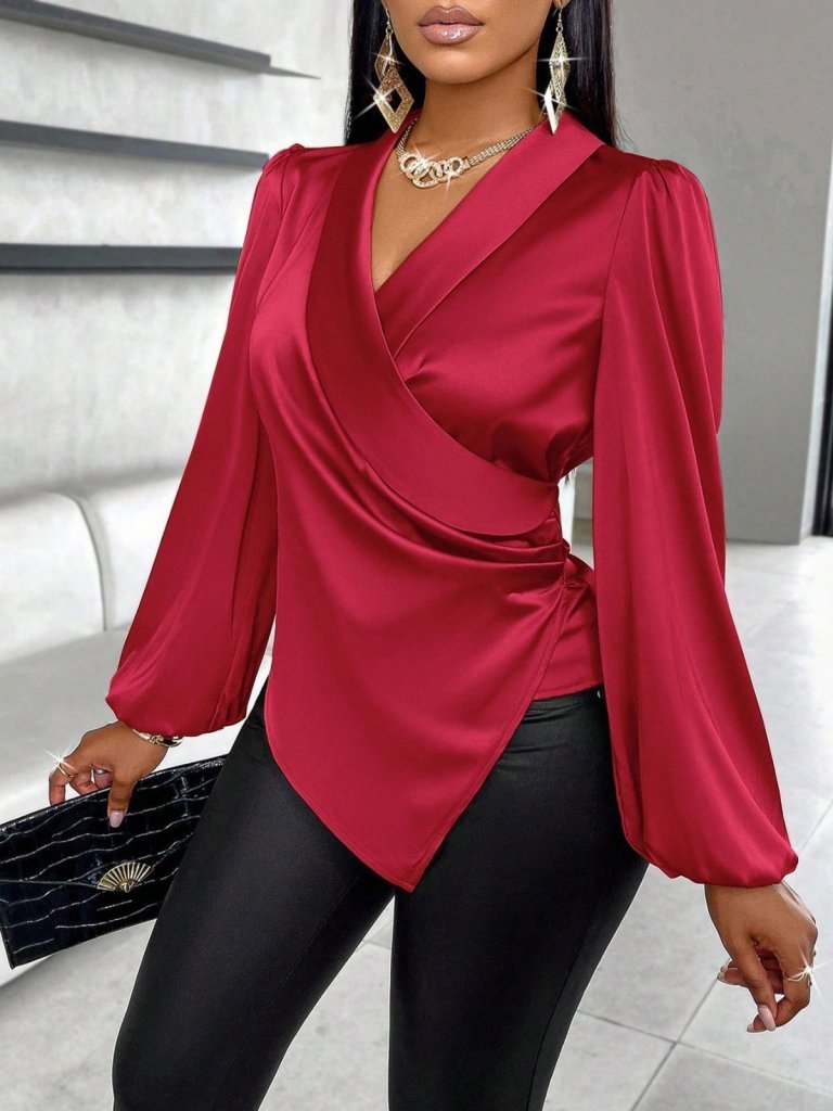 Kadın Uzun Kollu Kruvaze Yakalı Asimetrik Saten Bluz
