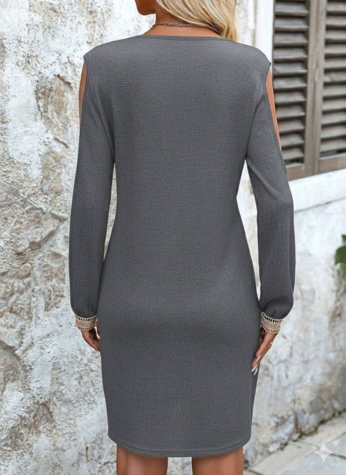 Kadın Uzun Kollu Omuzdan Açık V Dantel Yakalı Mini Waffle Elbise