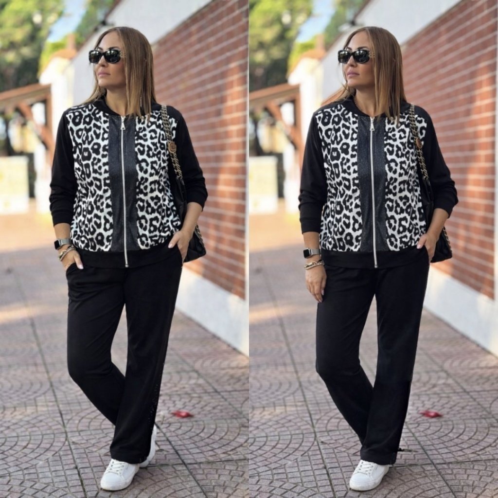 Kadın Uzun Kollu önden Fermuarlı Leopar Desenli Viskon Iki Iplik Bluz Ve Pantolon Ikili Takım
