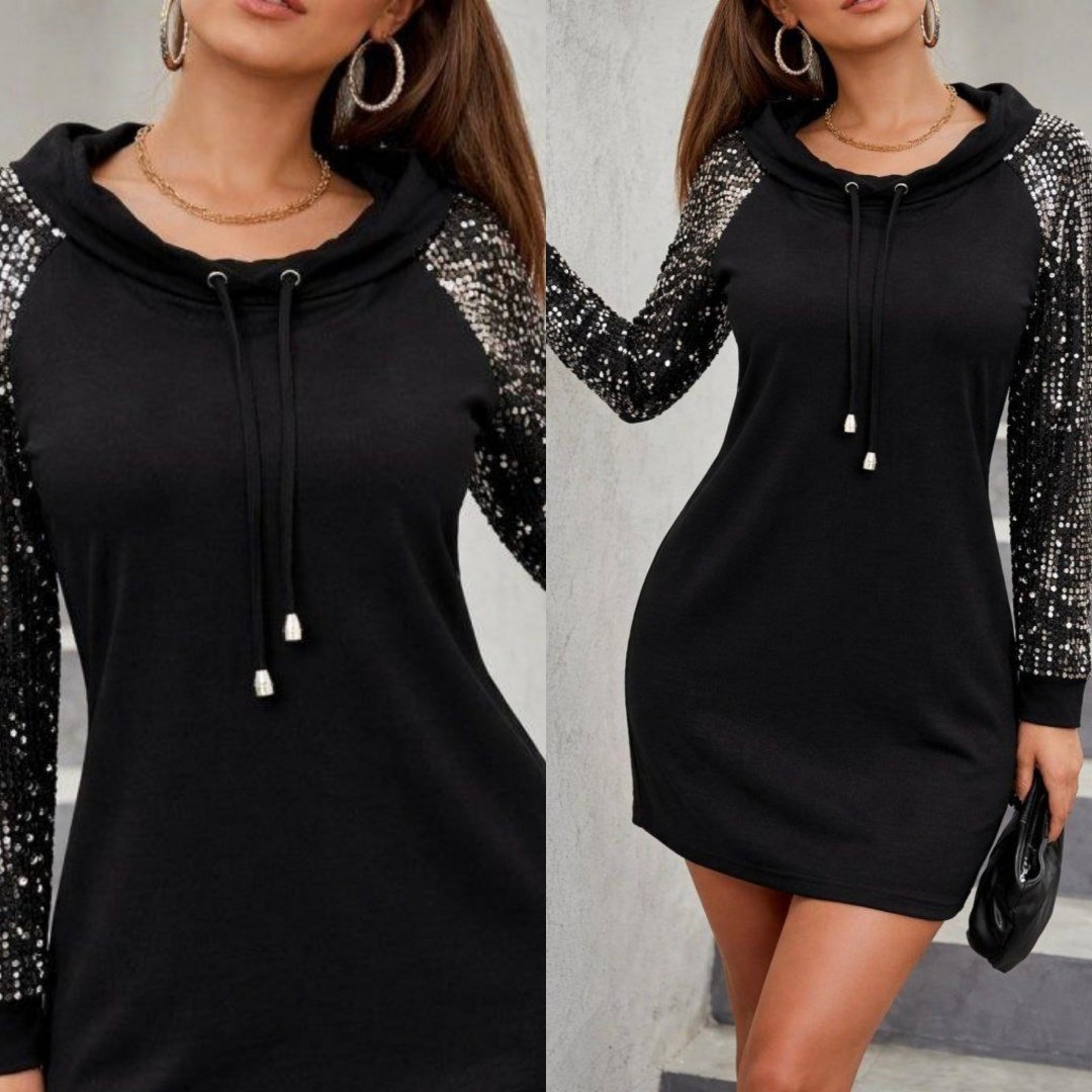 Kadın Uzun Kollu Pulpayetli Bağcıklı Cep Detaylı Mini Viskon Iki Iplik Elbise