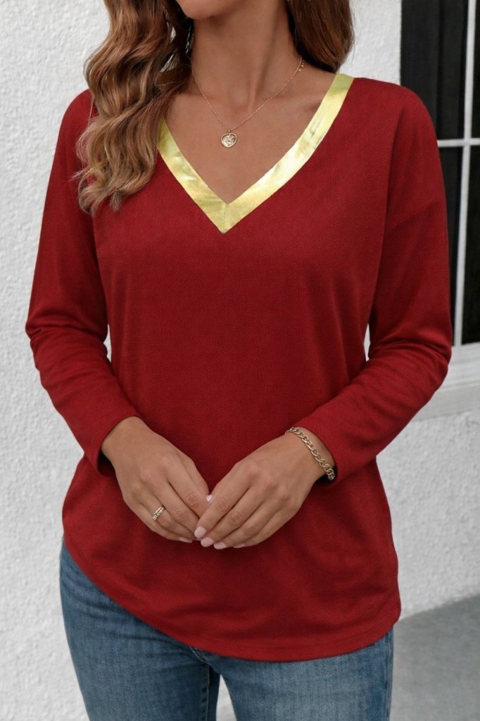 Kadın Uzun Kollu V Parlak Yaka Detaylı Viskon Bluz