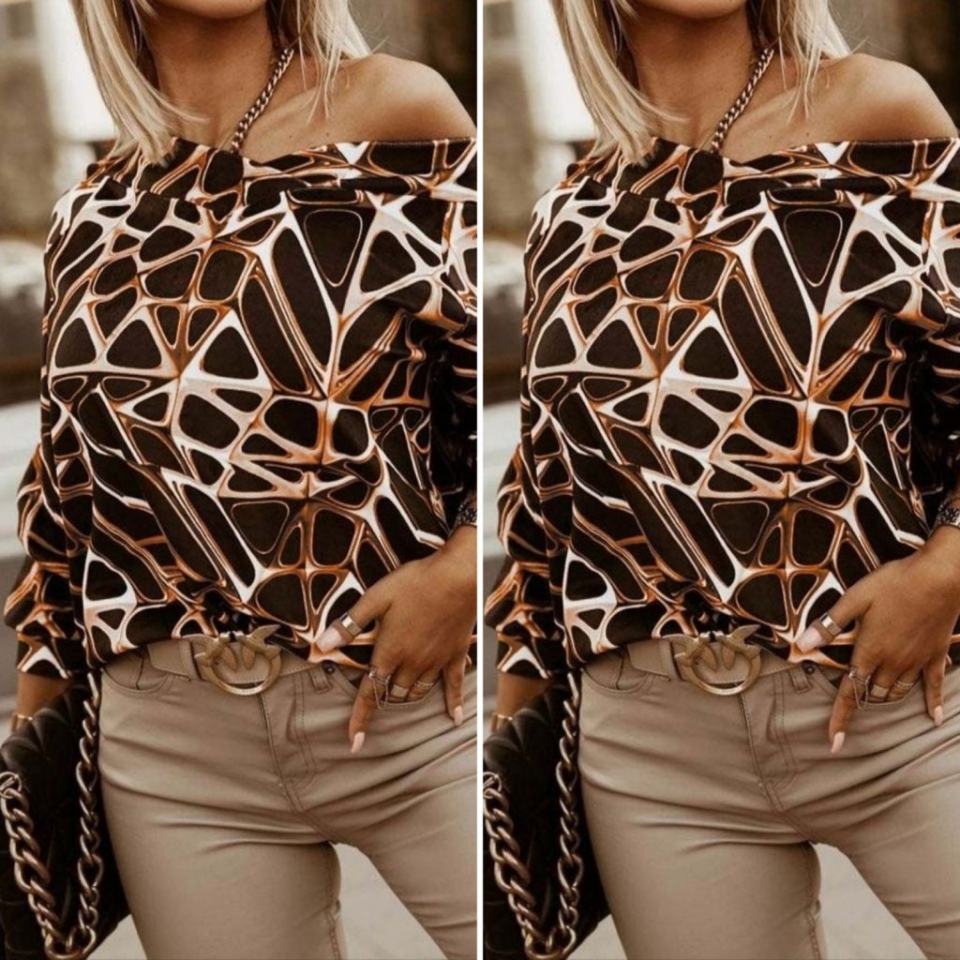 Kadın Uzun Kollu V Yaka Düşük Omuz Geometrik Desen şardonlu Dalgıç Bluz