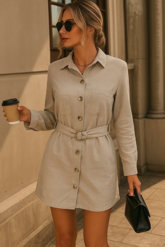Kadın Uzun Kollu Yakalı önden Düğmeli Beli Kuşaklı Mini Ithal Keten Elbise
