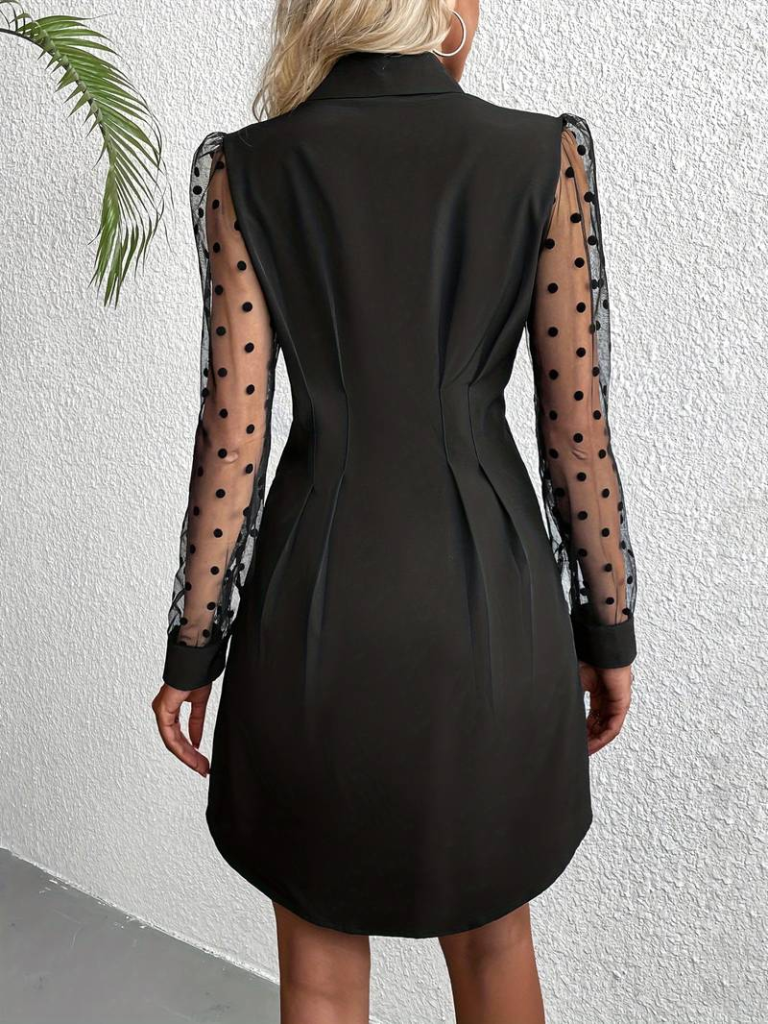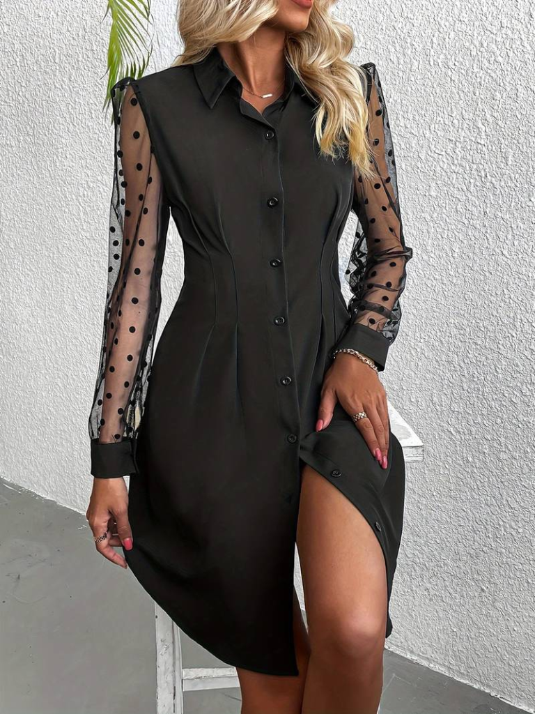 Kadın Uzun Puantiyeli Tül Kol Gömlek Yakalı önden Düğmeli Ithal Krep Elbise