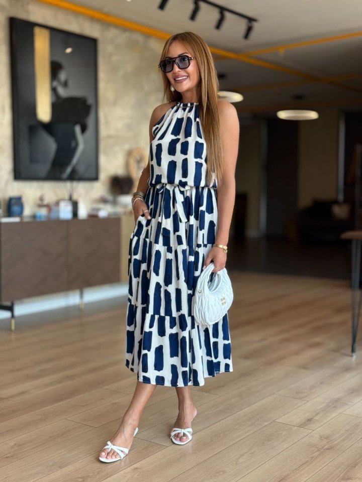 Kadın Viskon Kumaş Ip Askılı Halter Yaka Cepli Midi Boy Elbise Modelin Ölçüleri: Boy:165, Kg:55, Göğüs:90, Bel:72, Kalça: 100 Modelin üzerindeki ürün M/38 bedendir