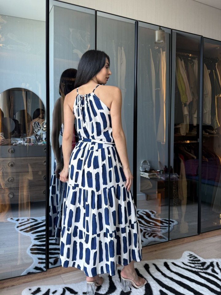 Kadın Askılı Yakası Fırfırlı Bağcıklı Desenli Uzun Süprem Elbise