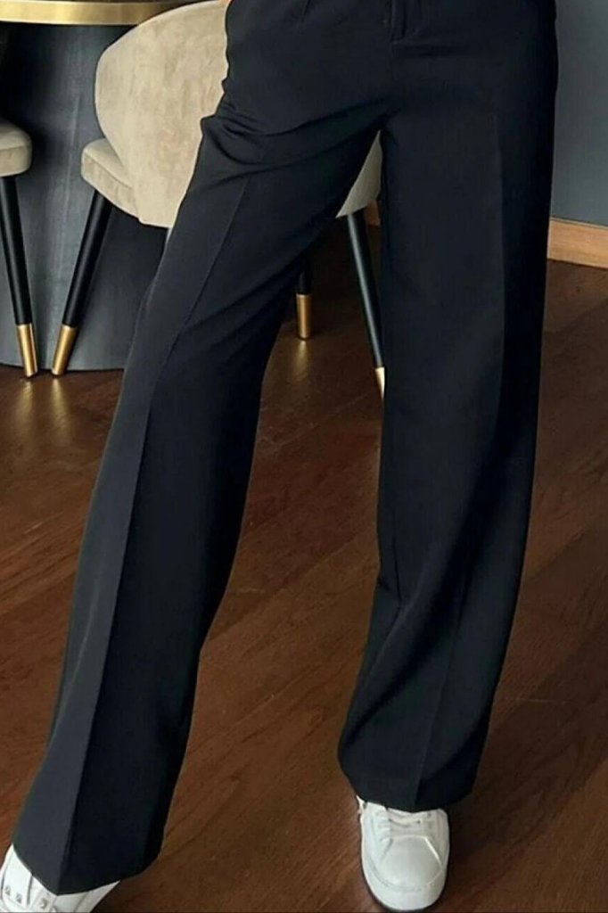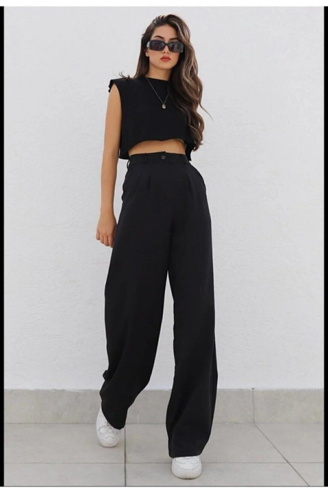 Kadın Yüksek Bel Geniş Paça Detaylı Cepli Ithal Krep Pantolon