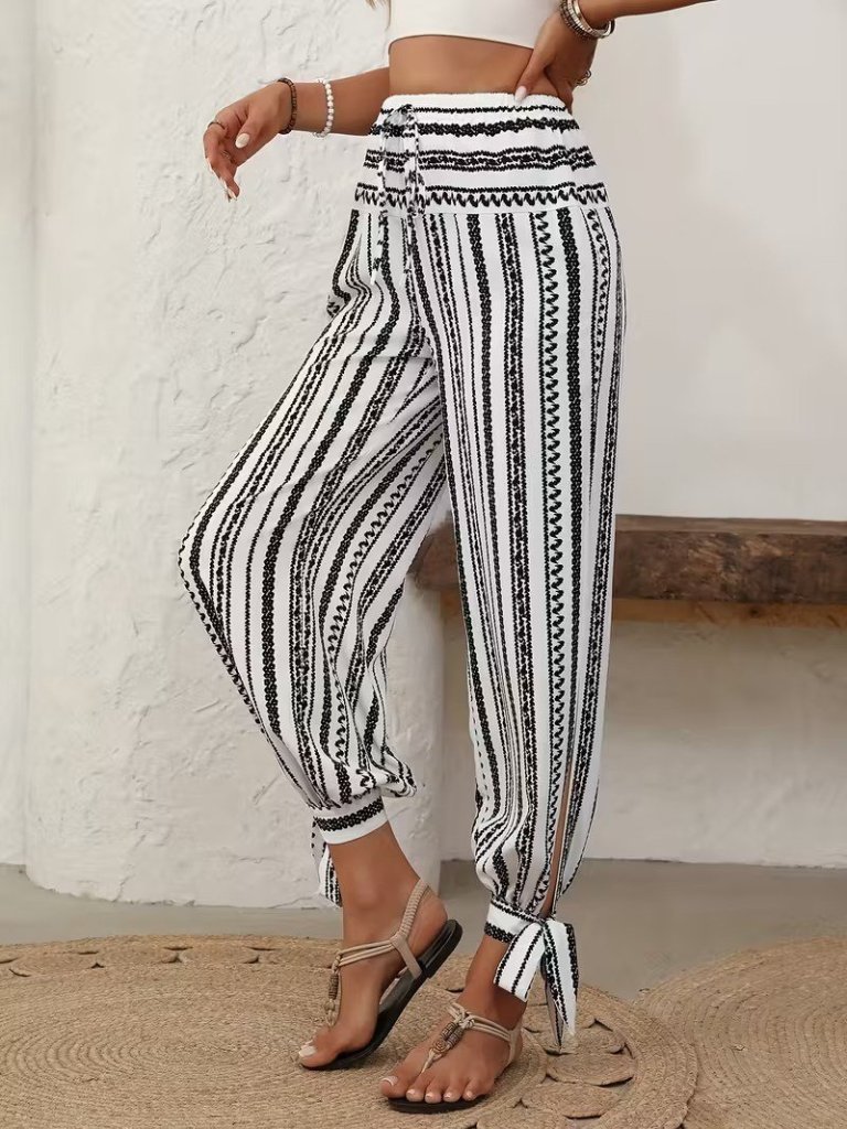 Kadın Yüksek Bel Desenli Paçadan Bağlamalı Yanları Yırtmaçlı Süprem Pantolon