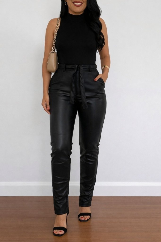 Kadın Yüksek Bel Kuşaklı Deri Pantolon