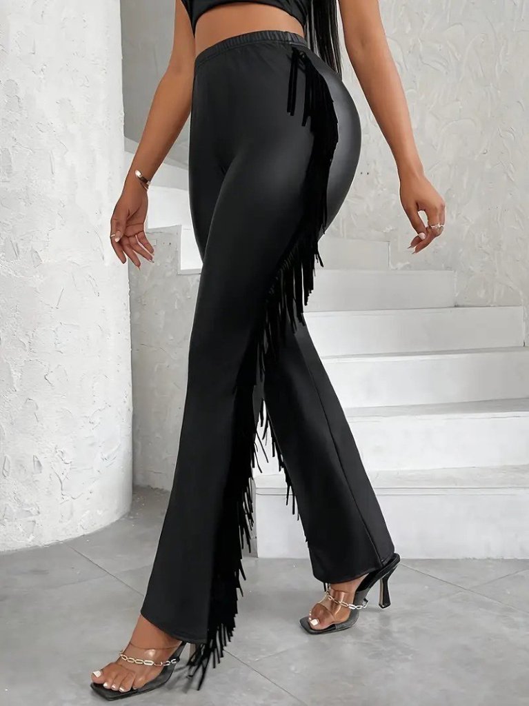 Kadın Yüksek Bel Yanlardan Püsküllü Deri Pantolon