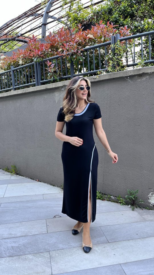 Kadın Kısa Kollu V Yakalı Yandan şerit Ve Yırtmaçlı Viskon Uzun Elbise