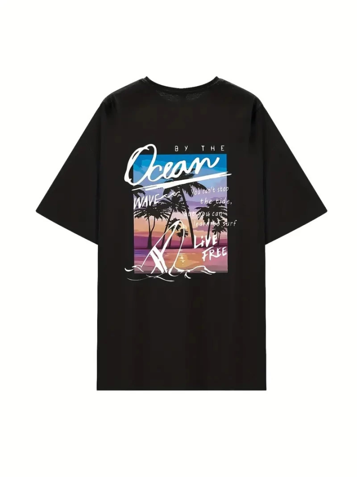 Kadınlar İçin Geniş Kesim Tişört – Kısa Kollu, Bol Kesim, Manzaralı Okyanus Baskı, Günlük Yazlık Üst, Siyah- Siyah
