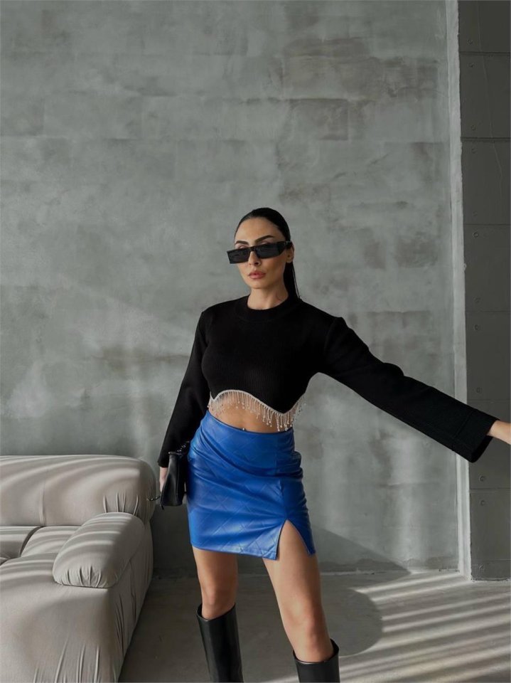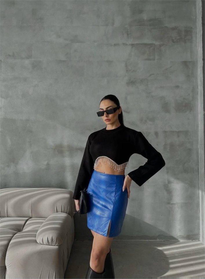 KAPİTONE DERİ ETEK YIRTMAÇLI – Saks Modelin Ölçüleri: Boy:165, Kg:55, Göğüs:90, Bel:72, Kalça: 100 Modelin üzerindeki ürün M/38 bedendir