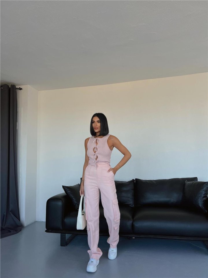 KARGO PANTOLON – Somon Modelin Ölçüleri: Boy:165, Kg:55, Göğüs:90, Bel:72, Kalça: 100 Modelin üzerindeki ürün M/38 bedendir