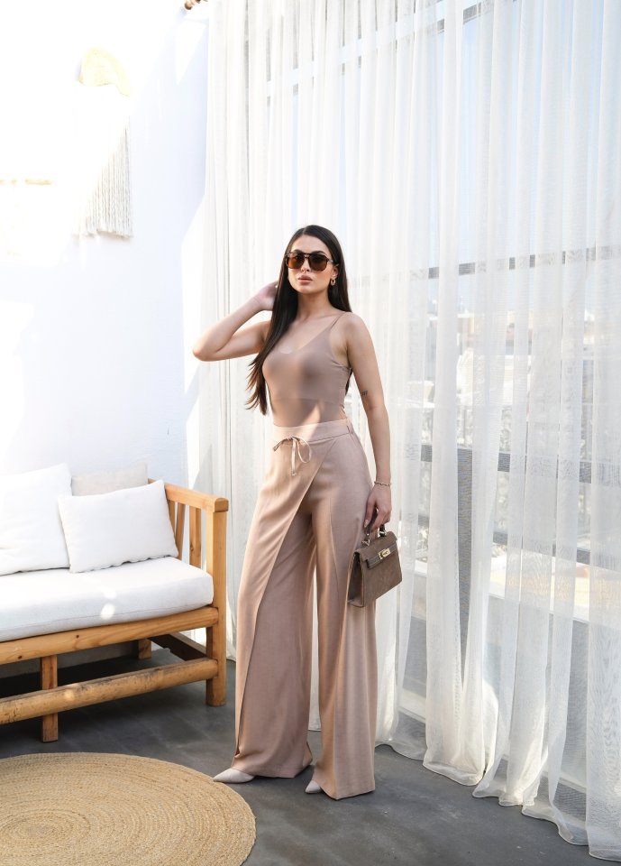 Keten Önü Çapraz Parçali Lasti̇kli̇ Ve Bağcikli Geni̇ş Paça Pantolon