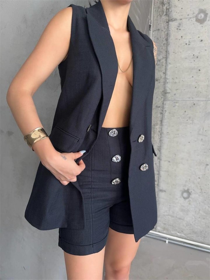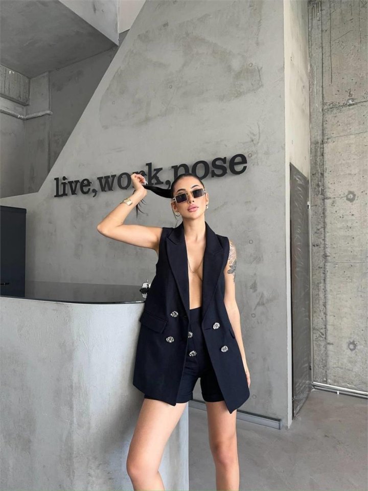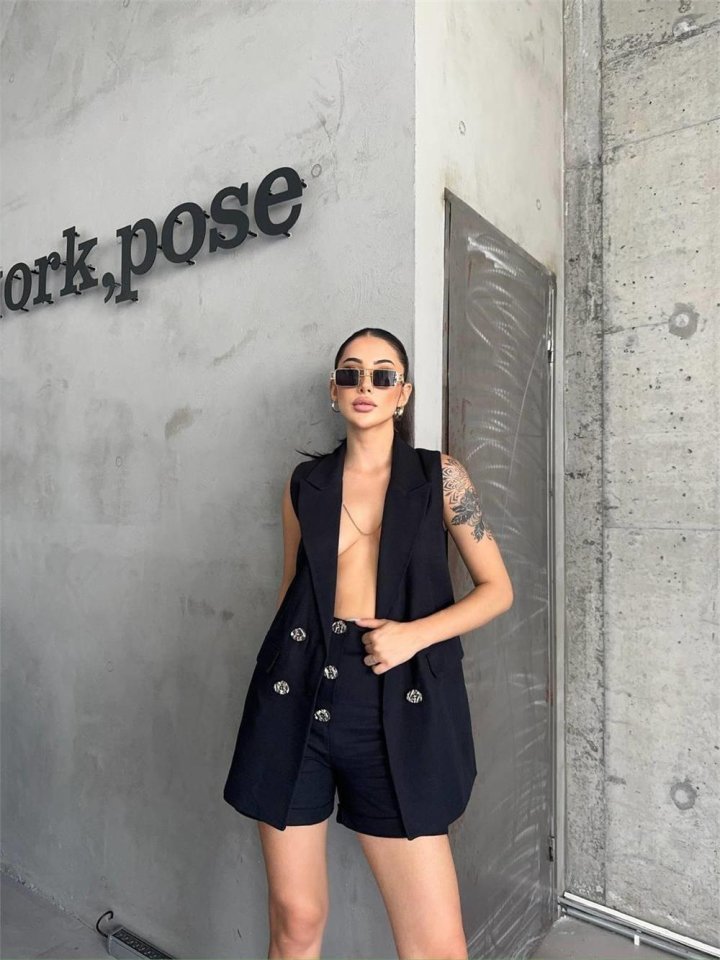 KETEN YELEK – ŞORT TAKIM – Siyah Modelin Ölçüleri: Boy:165, Kg:55, Göğüs:90, Bel:72, Kalça: 100 Modelin üzerindeki ürün M/38 bedendir