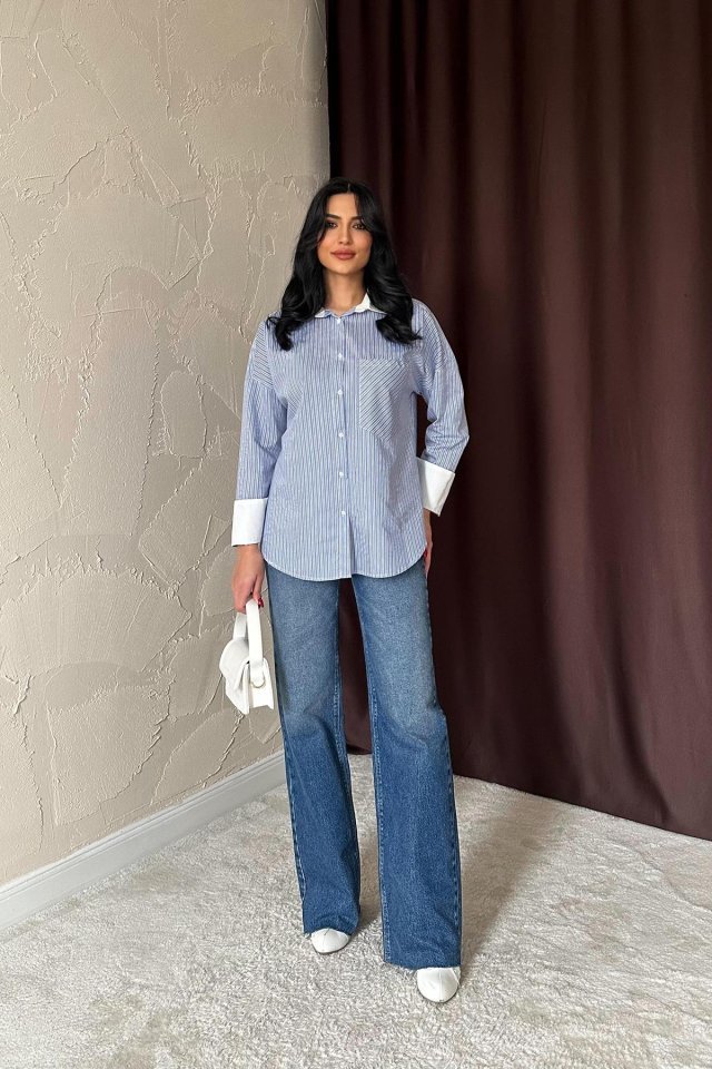 Mavi Çizgili Poplin Uzun Kol Gömlek Modelin Ölçüleri: Boy:165, Kg:55, Göğüs:90, Bel:72, Kalça: 100 Modelin üzerindeki ürün M/38 bedendir