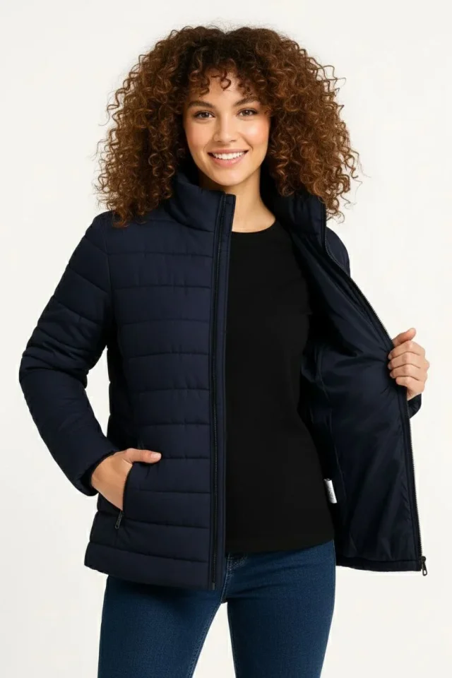 Mikro Su İtici Kapitone Baskılı Astarlı Fermuarlı Bomber Mont – Lacivert Modelin Ölçüleri: Boy:165, Kg:55, Göğüs:90, Bel:72, Kalça: 100 Modelin üzerindeki ürün M/38 bedendir