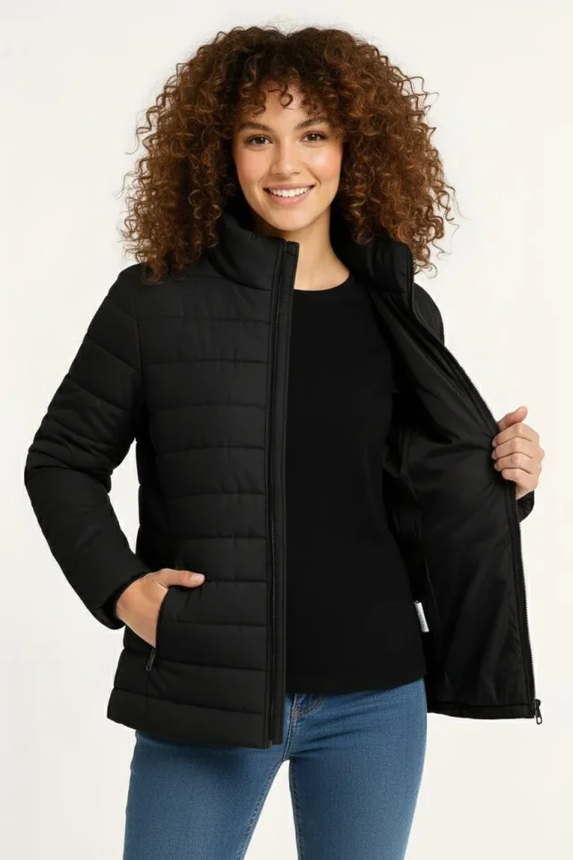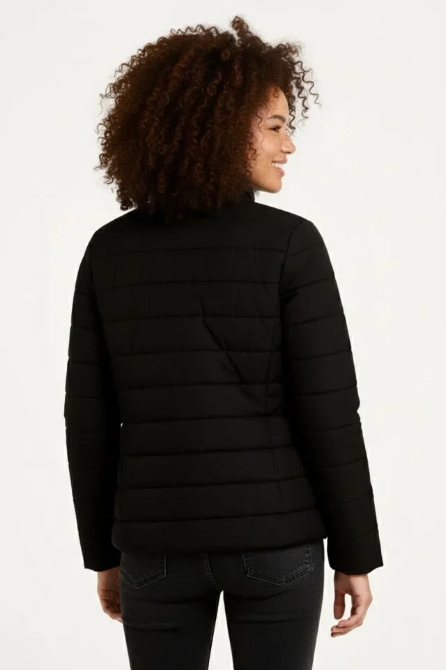 Mikro Su İtici Kapitone Baskılı Astarlı Fermuarlı Bomber Mont – Siyah Modelin Ölçüleri: Boy:165, Kg:55, Göğüs:90, Bel:72, Kalça: 100 Modelin üzerindeki ürün M/38 bedendir