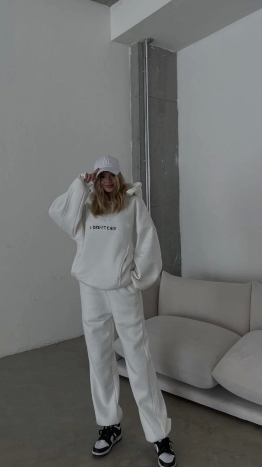 Nakış İşlemeli Üç İplik Sweat Takım- Beyaz Modelin Ölçüleri: Boy:165, Kg:55, Göğüs:90, Bel:72, Kalça: 100 Modelin üzerindeki ürün M/38 bedendir
