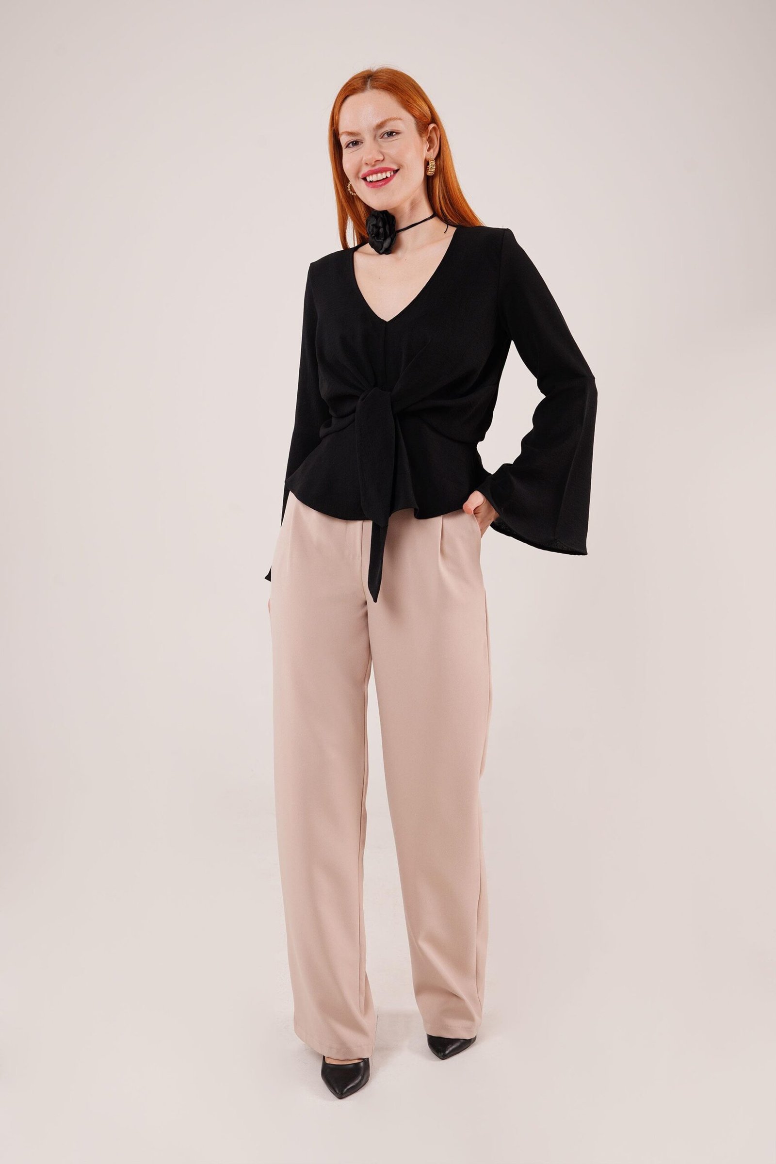 Ön Bağlamalı Volan Kol Siyah Bluz Modelin Ölçüleri: Boy:165, Kg:55, Göğüs:90, Bel:72, Kalça: 100 Modelin üzerindeki ürün M/38 bedendir