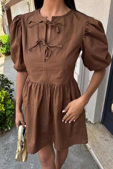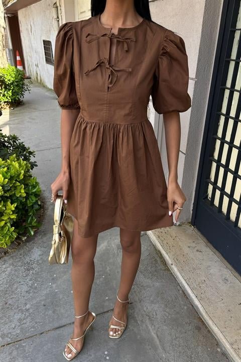 Önü Fiyonk Bağlamalı Ve Balon Kollu Elbise 2893