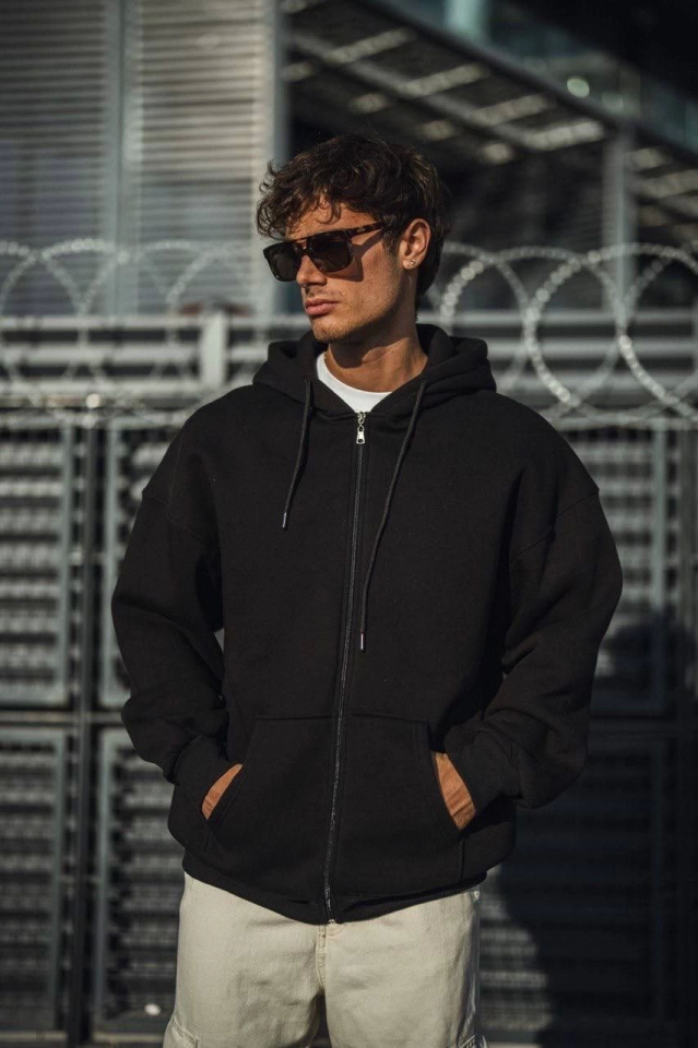 Oversize Tam Fermuarlı Uzun Kol Hırka – Siyah