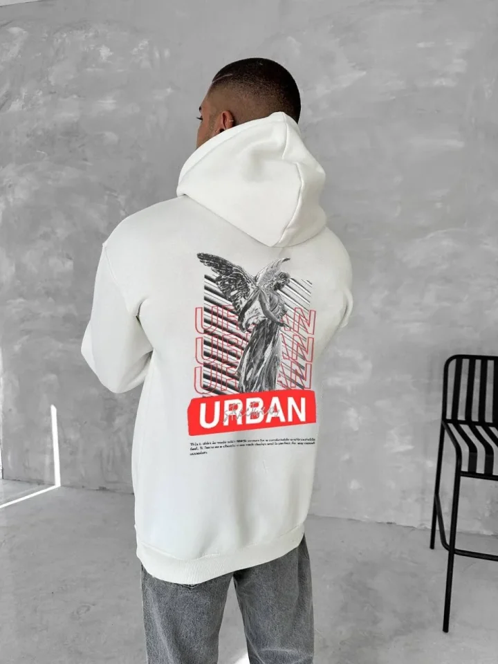 Erkek Şeritli Kapüşonlu Sweatshirt Oversize 3 Iplik Pamuklu – Beyaz