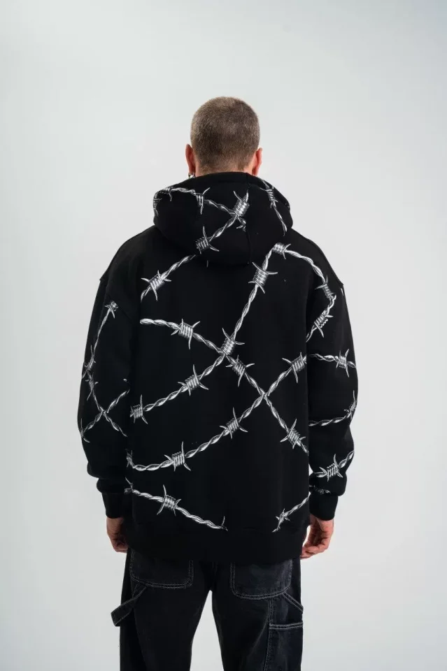 Erkek Oversize Sweatshirt – Siyah Renk Ön Ve Sırt Baskılı, Üç İplik İçi Pamuklu Kumaş, Rahat Kalıp, Ribanalı Kışlık Sweat Winagain Polizei Serisi – Siyah