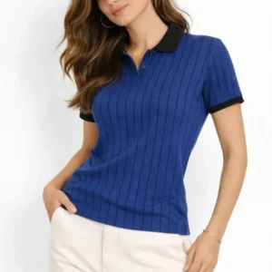 Polo Yaka Çizgili Tişört Kısa Kol Düğmeli Yazlık T-Shirt – Saks Mavisi