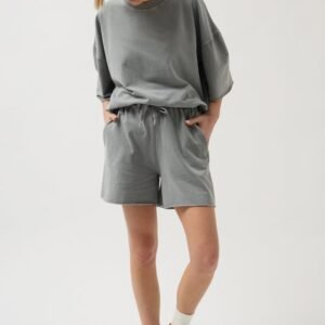 Erkek Keten Kumaş Cepli Rahat Kesim Bel Lastikli Şort – Gri