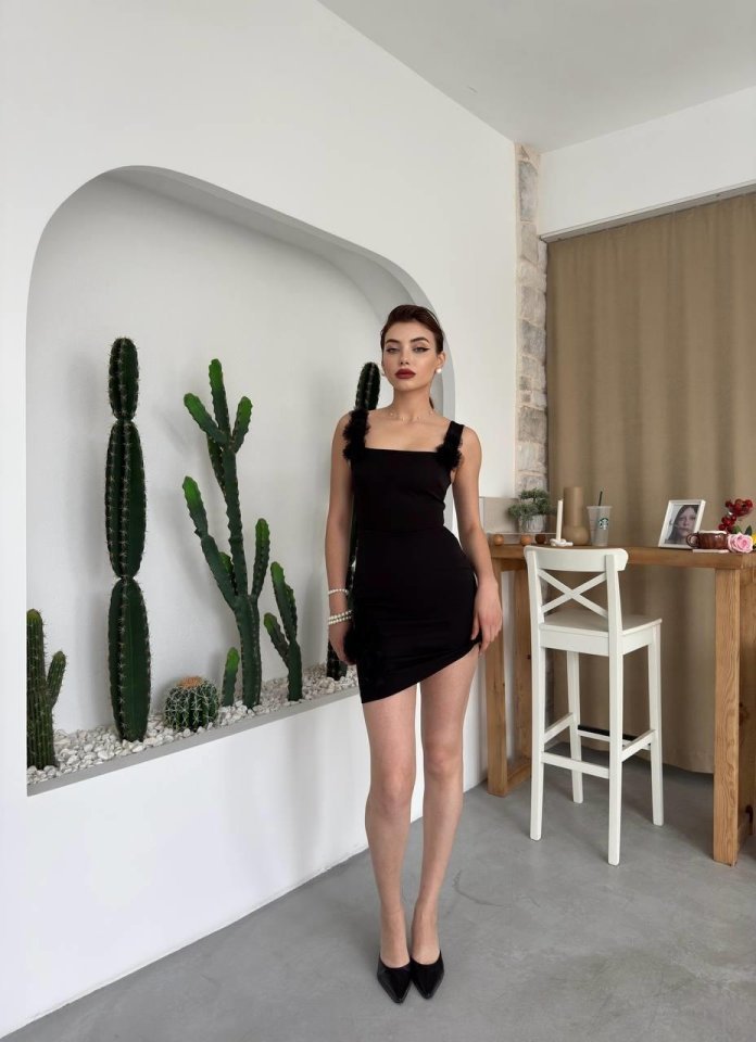 Kadın Askılı V Yakalı üst Dantel Alt Süprem Mini Elbise