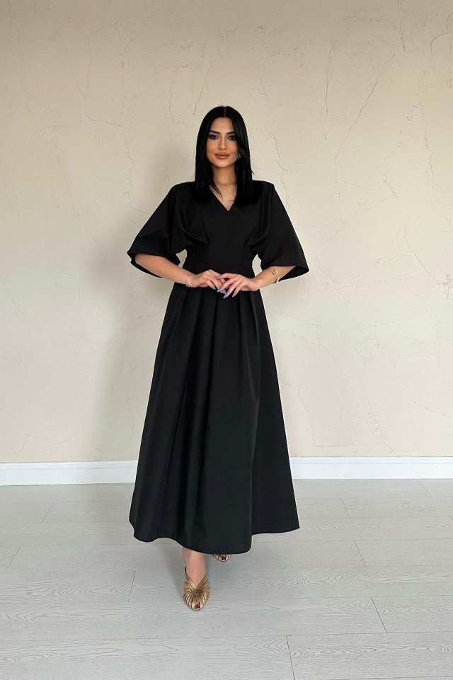 Siyah Pileli Uzun Elbise Modelin Ölçüleri: Boy:165, Kg:55, Göğüs:90, Bel:72, Kalça: 100 Modelin üzerindeki ürün M/38 bedendir