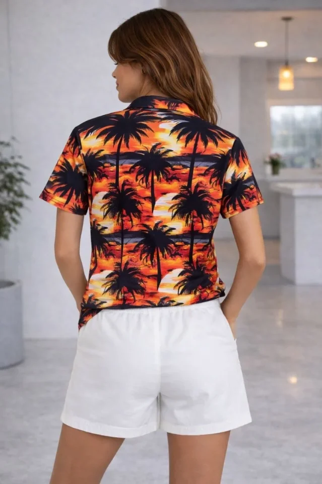 Tropikal Palmiye Desenli Gömlek Şort Takım Yazlık Rahat Kalıp – Desenli Modelin Ölçüleri: Boy:165, Kg:55, Göğüs:90, Bel:72, Kalça: 100 Modelin üzerindeki ürün M/38 bedendir