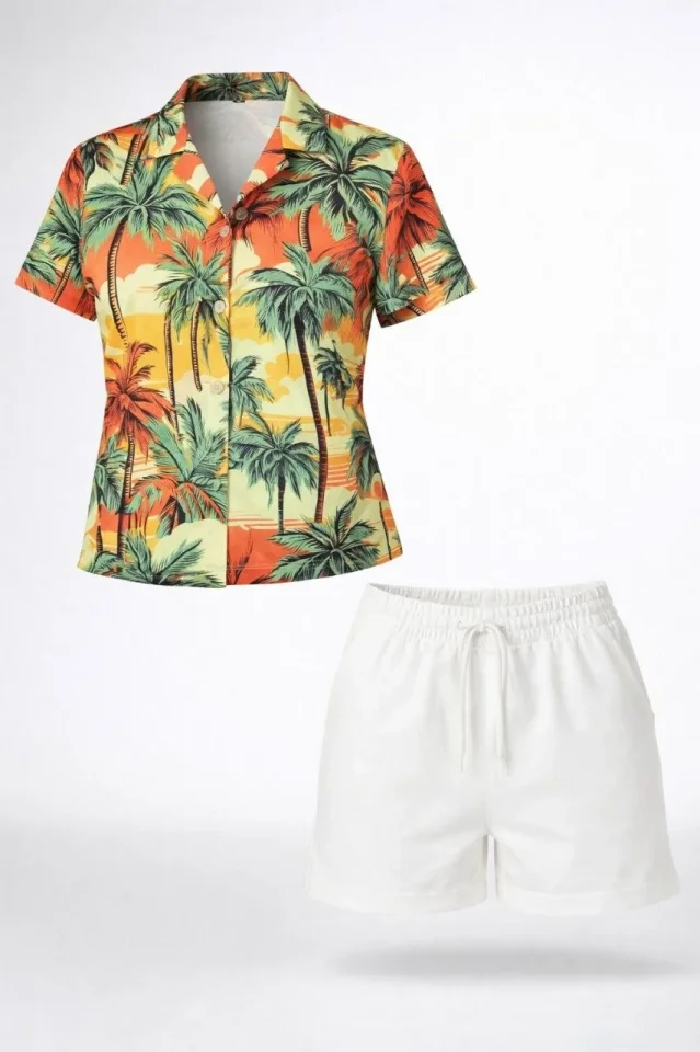 Tropikal Palmiye Desenli Kısa Kol Gömlek Şort Takım Yazlık Rahat – Desenli