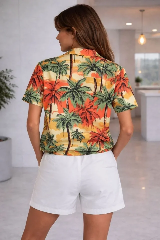 Tropikal Palmiye Desenli Kısa Kol Gömlek Şort Takım Yazlık Rahat – Desenli Modelin Ölçüleri: Boy:165, Kg:55, Göğüs:90, Bel:72, Kalça: 100 Modelin üzerindeki ürün M/38 bedendir