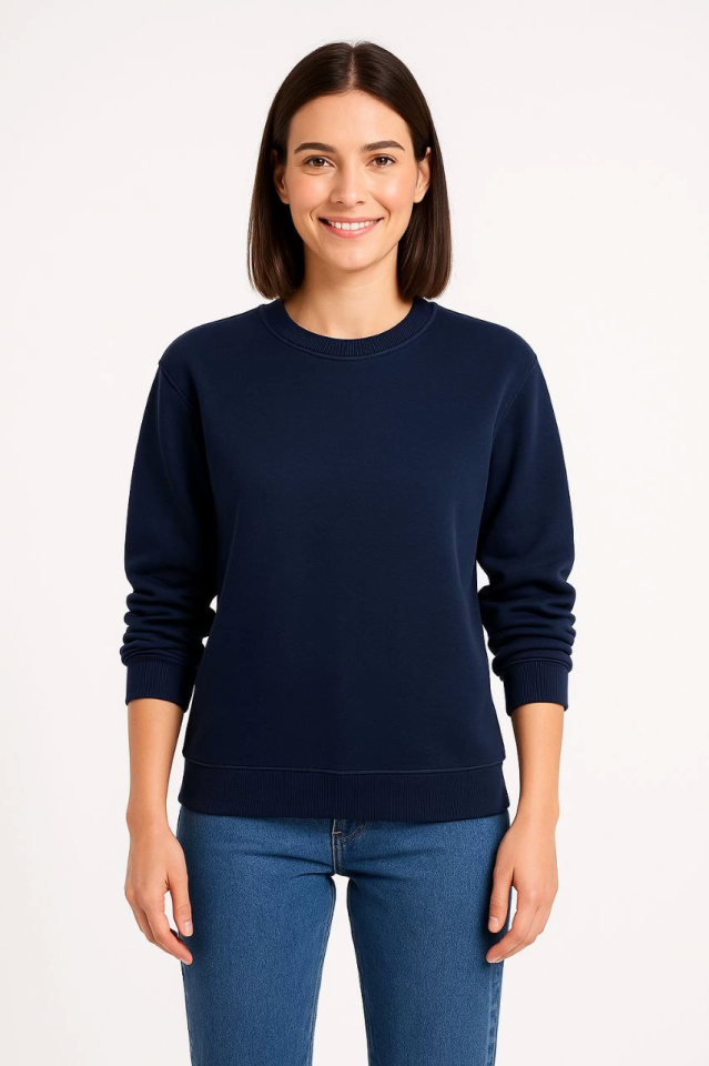 Üç İplik Düz Bisiklet Yaka SweatShirt – Lacivert Modelin Ölçüleri: Boy:165, Kg:55, Göğüs:90, Bel:72, Kalça: 100 Modelin üzerindeki ürün M/38 bedendir